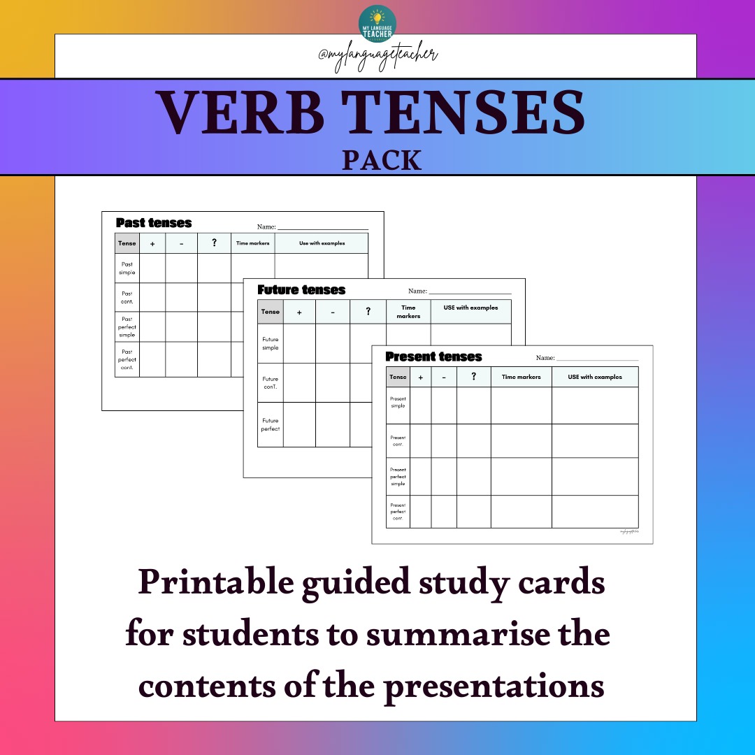 Las secciones genéricas de todas las presentaciones son: use, conjugation, time markers, contrast of tenses, practice and keys to exercises