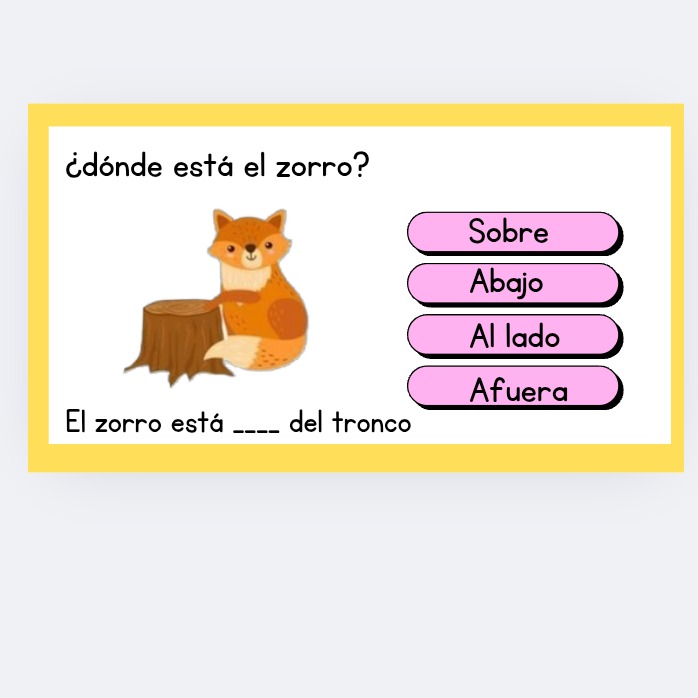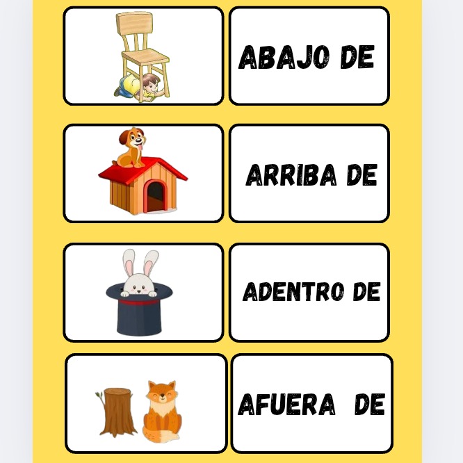 ⭐ +20 Flashcards Visuales (Páginas 2-5): Tarjetas grandes y a todo color con ilustraciones infantiles perfectas para la memorización y juegos en grupo. Incluyen preposiciones simples y compuestas (como DEBAJO DE y AL LADO DE).
