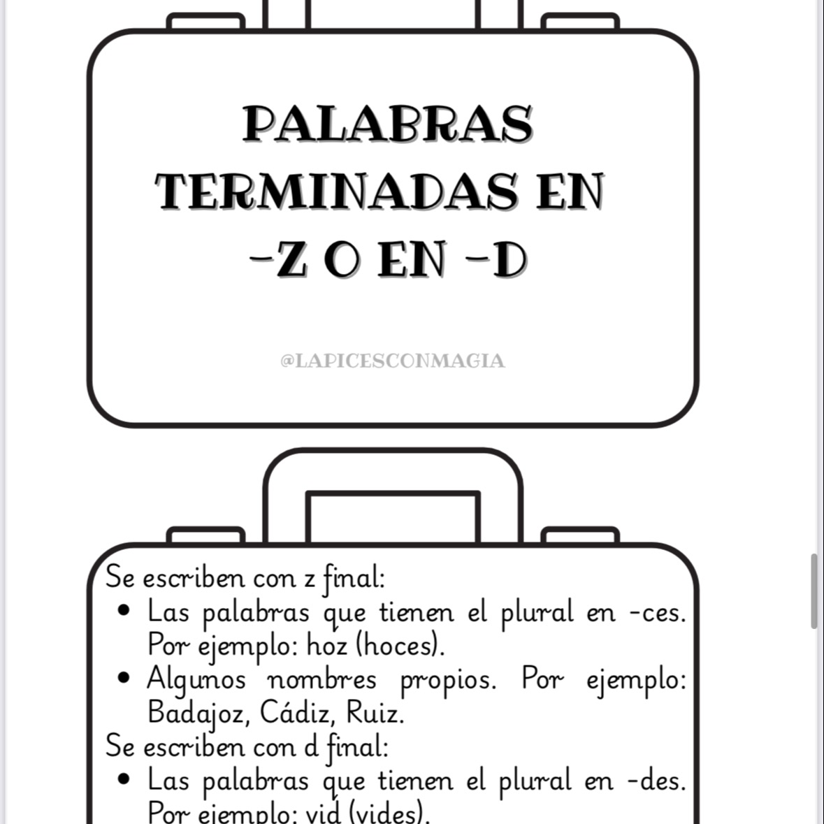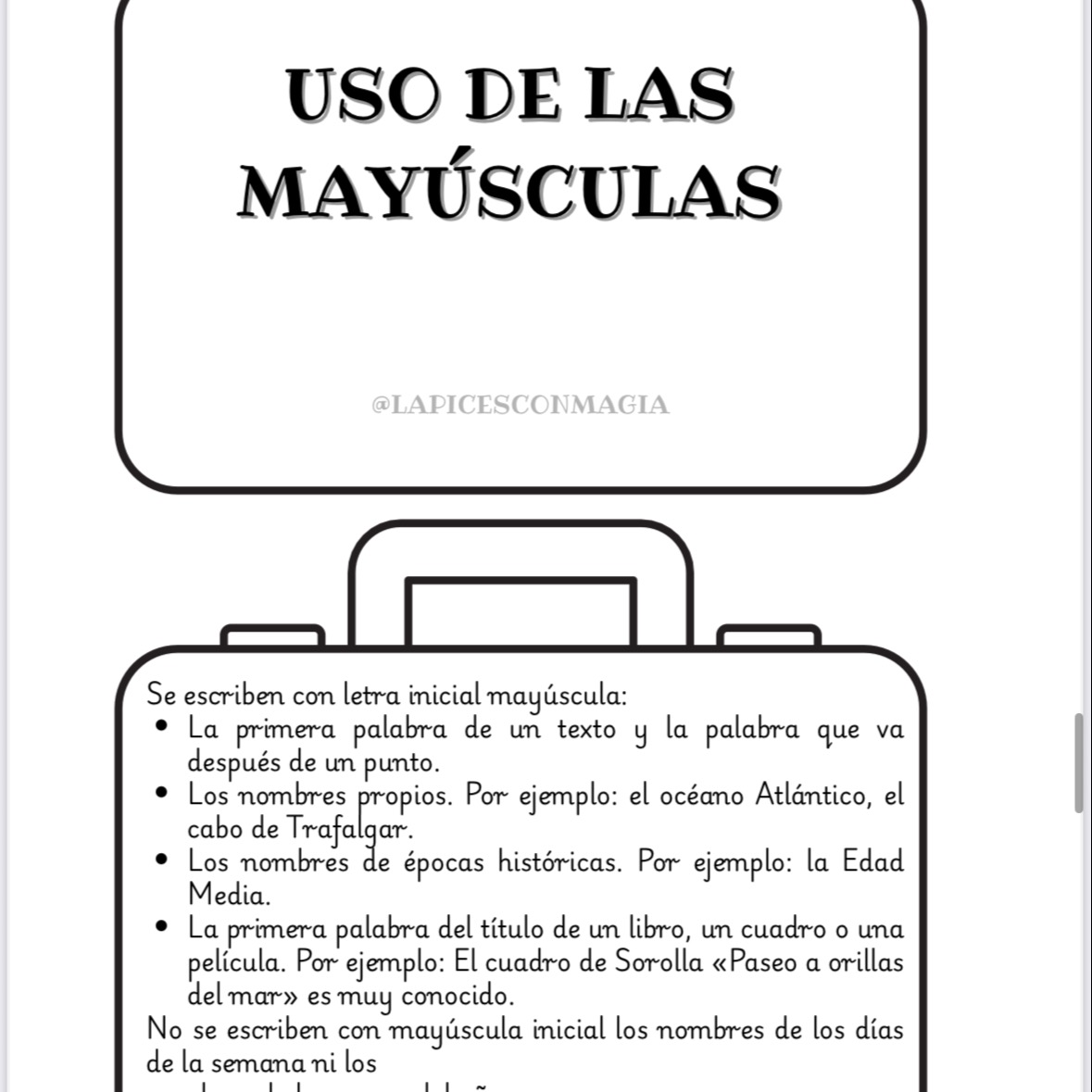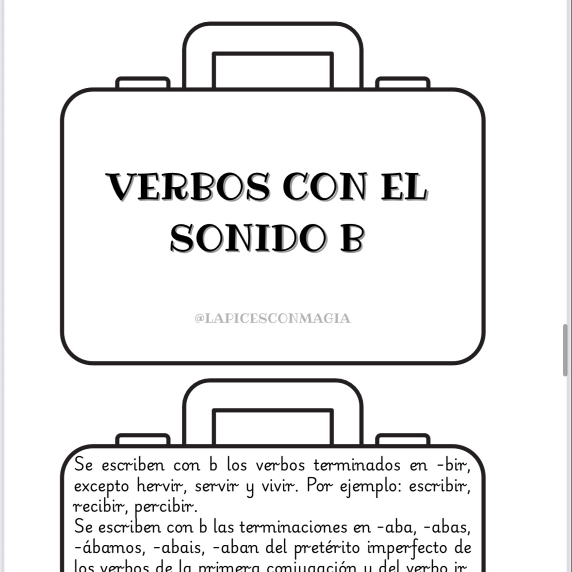Cada maleta contiene una regla ortográfica ilustrada con iconografía 🧠📖 que facilita la comprensión, la memoria visual y el aprendizaje significativo. Están diseñadas en blanco y negro ⚪⚫ para que los alumnos puedan colorearlas 🎨, recortarlas ✂️ y personalizarlas a su gusto.