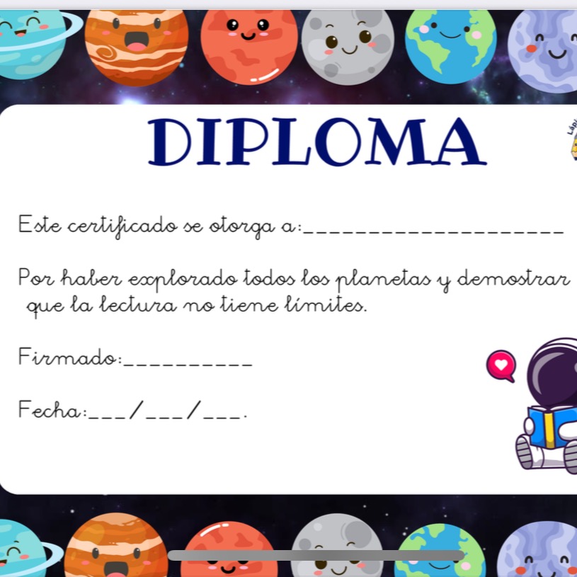Cuando el alumnado completa su viaje lector, recibirá un diploma personalizado que certifica su exploración completa del universo de los libros y celebra que… ¡la lectura no tiene límites! 🚀