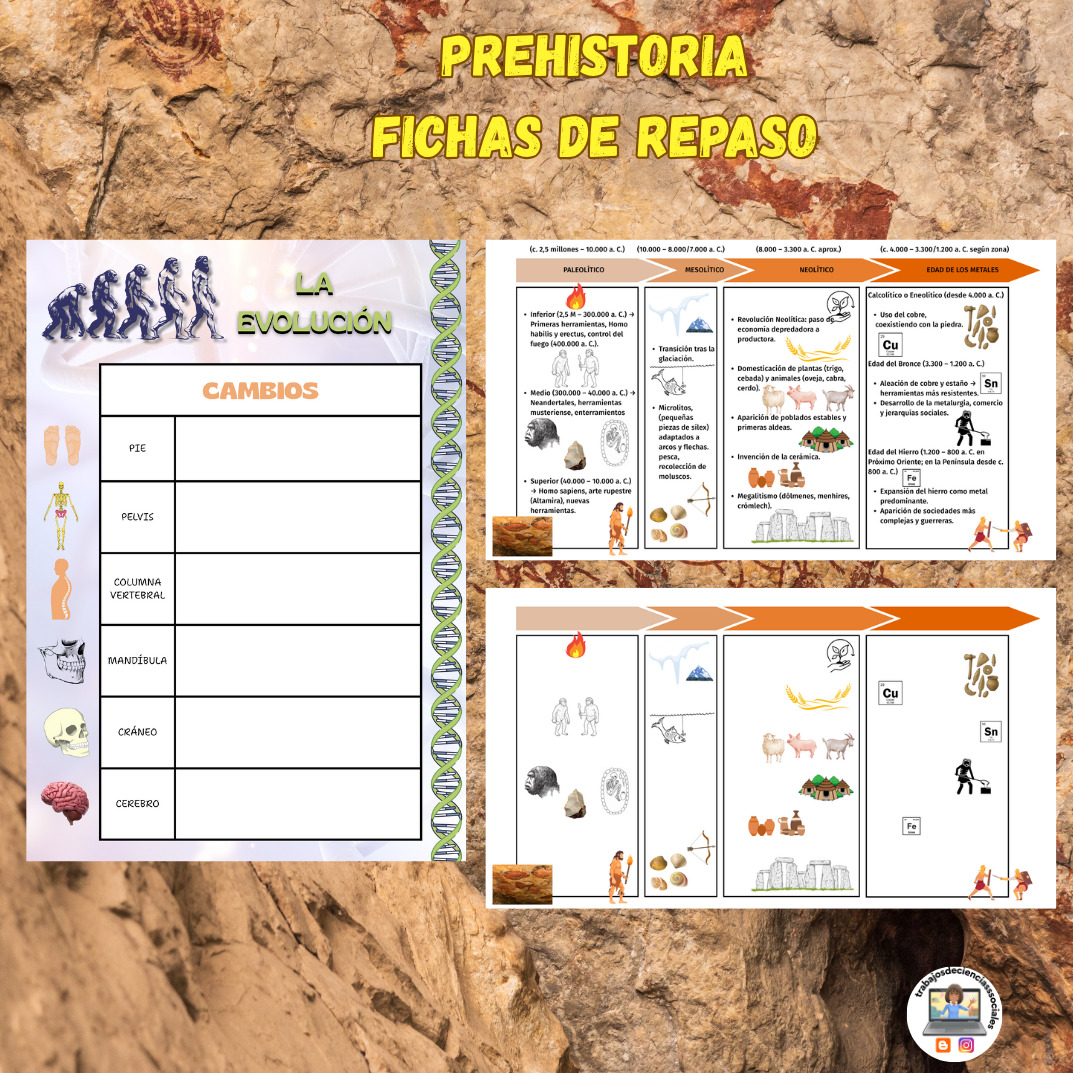 A través de una selección de fichas variadas, el alumnado podrá recorrer los principales contenidos de la materia: desde el proceso de hominización y la evolución de las especies humanas hasta los grandes periodos de la Prehistoria (Paleolítico, Neolítico y Edad de los Metales).
