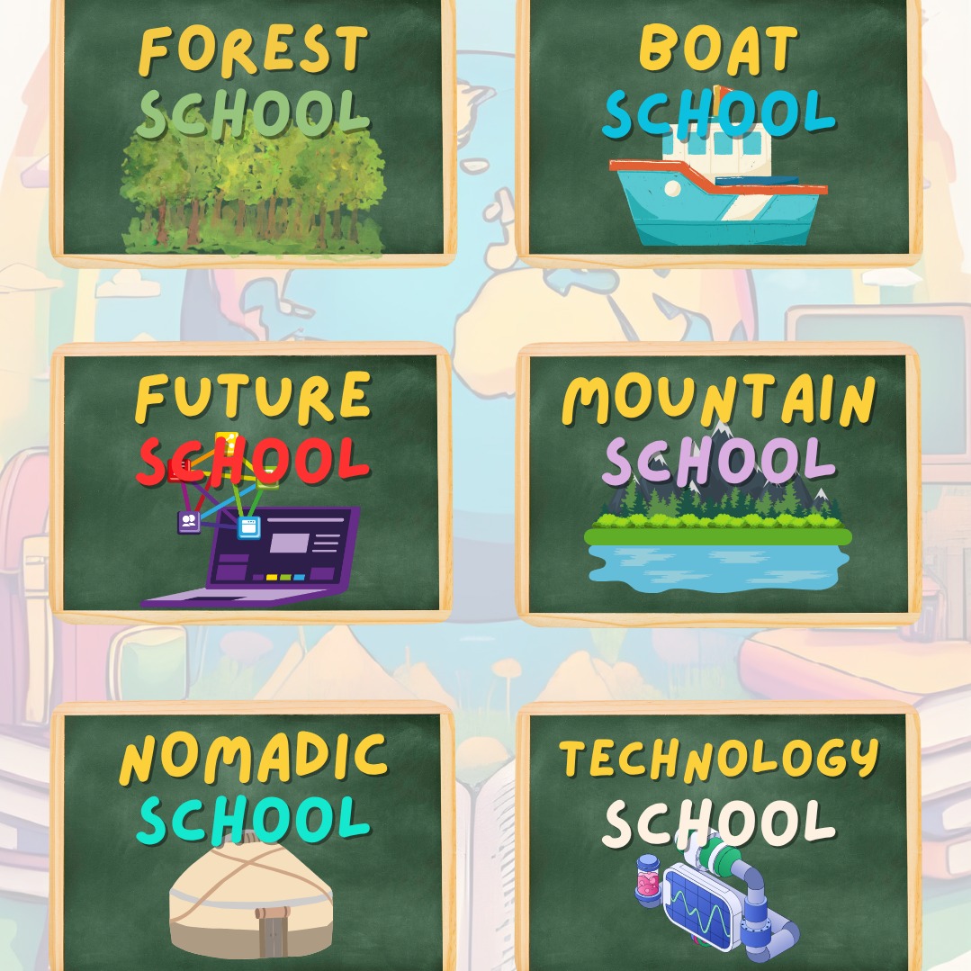🏕️ Forest School · 🚤 Boat School · 🏙️ Future School · 🏔️ Mountain School · 🐪 Nomadic School · 💻 Technology School