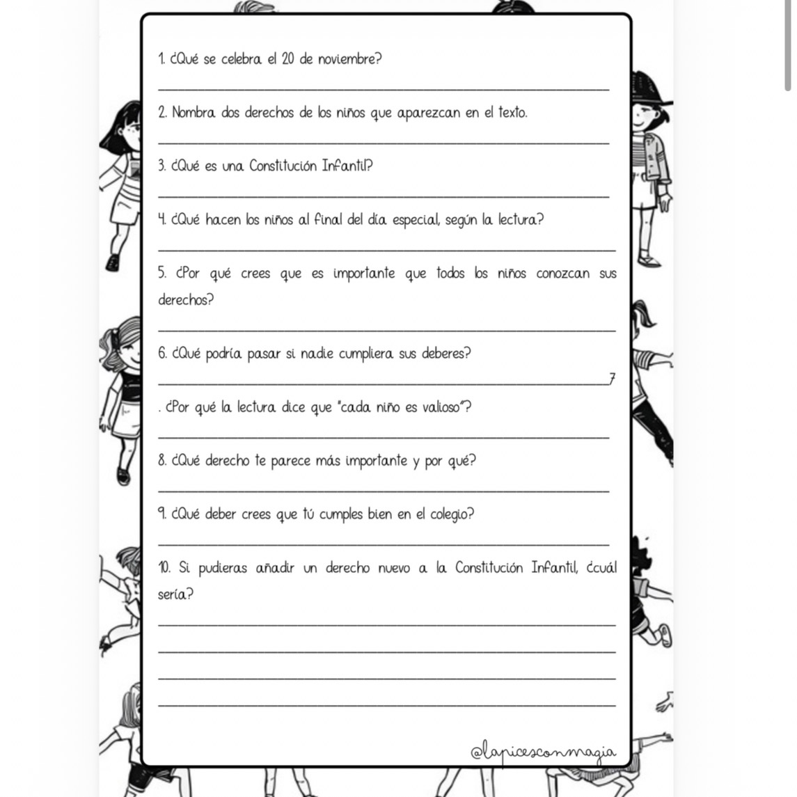 Incluyen preguntas literales, inferenciales y críticas para trabajar la comprensión lectora mientras se reflexiona sobre el papel de la infancia en la sociedad.