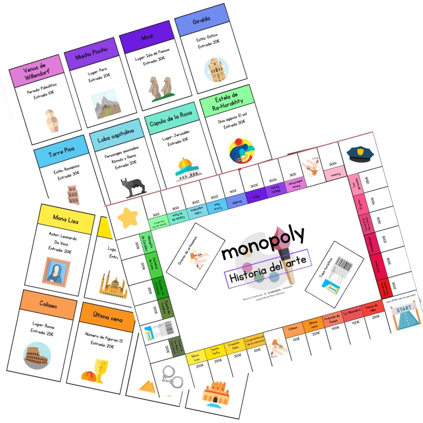 El recurso “Monopoly Historia del Arte” es un juego didáctico inspirado en el clásico Monopoly, pero adaptado para aprender de manera activa y lúdica sobre obras emblemáticas, artistas, estilos y monumentos. El tablero (visible en la página 3 del PDF) incluye casillas con obras famosas como La Mona Lisa, La Creación de Adán, Partenón, Machu Picchu, Nuestra Señora de Notre Dame o El Grito, entre muchas otras. Las tarjetas de propiedad (páginas 4–7) contienen información clave: autor, estilo, ubicación histórica o coste de "entrada", lo que permite al alumnado estudiar arte mientras juega.