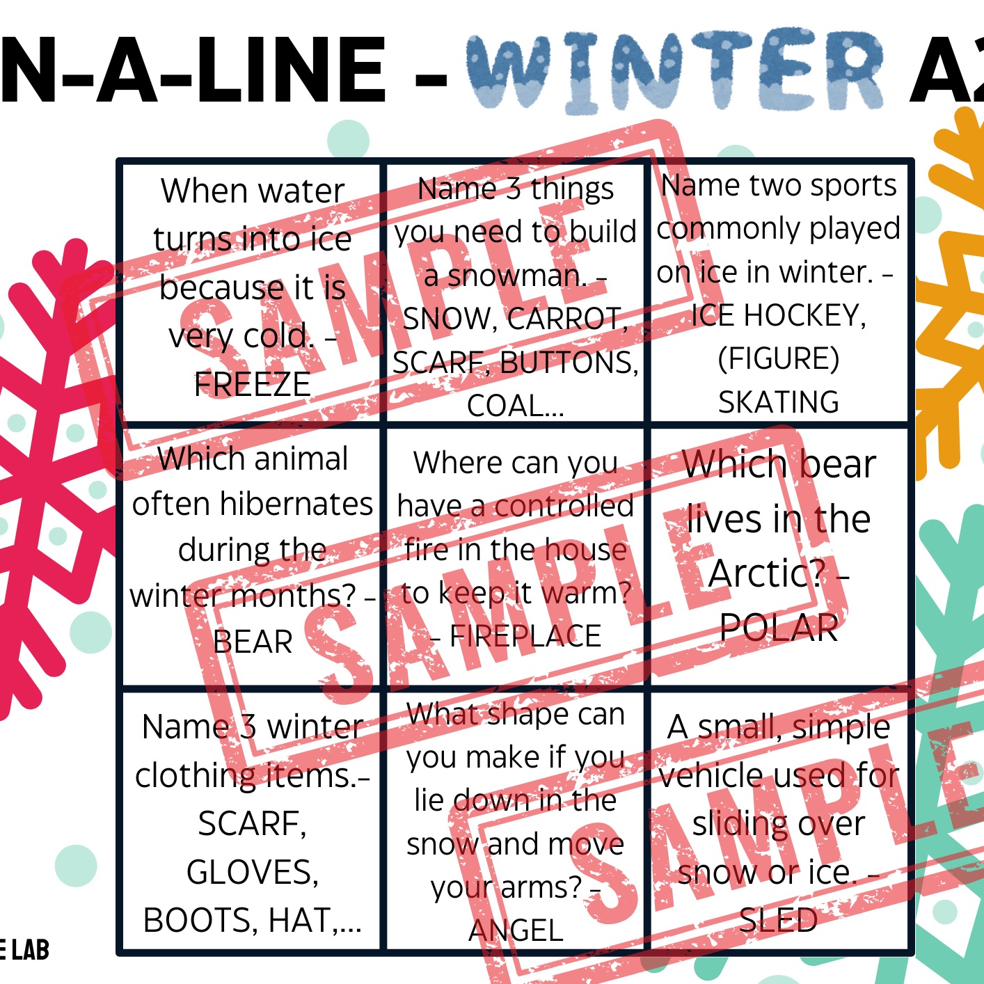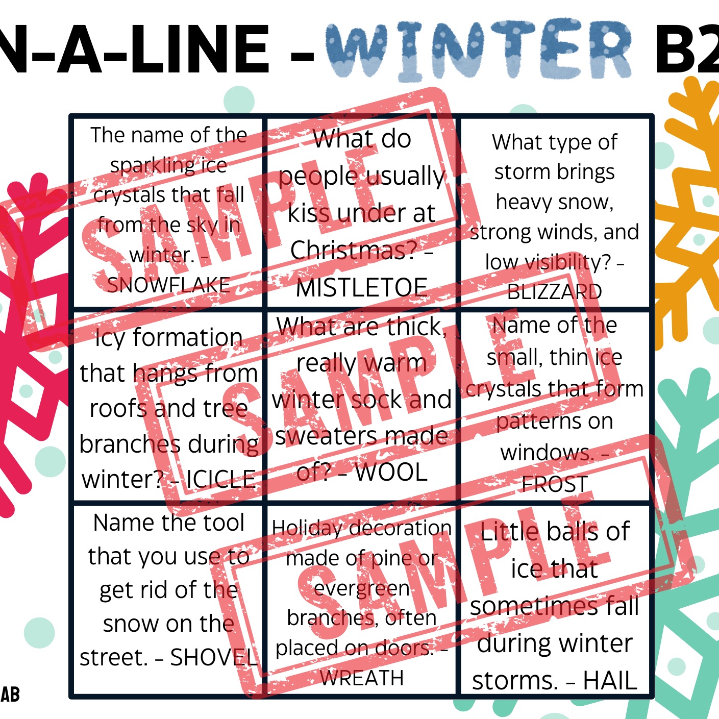 You can either project the empty grid included or simply draw a 3x3 grid on the board. Mark the columns as A, B, C, and the rows as 1, 2, 3. Form two groups and decide who will be X (cross) and who will be O (nought). The first group should pick a spot on the grid (e.g., B2). They can win that spot and place their mark if they answer the question for that spot correctly. If they don’t know the right answer, the other group has the chance to respond and can win the spot. If no one answers correctly, it remains empty. The goal, as in every 3-IN-A-LINE game, is to get three of your marks in a line.