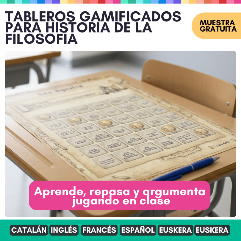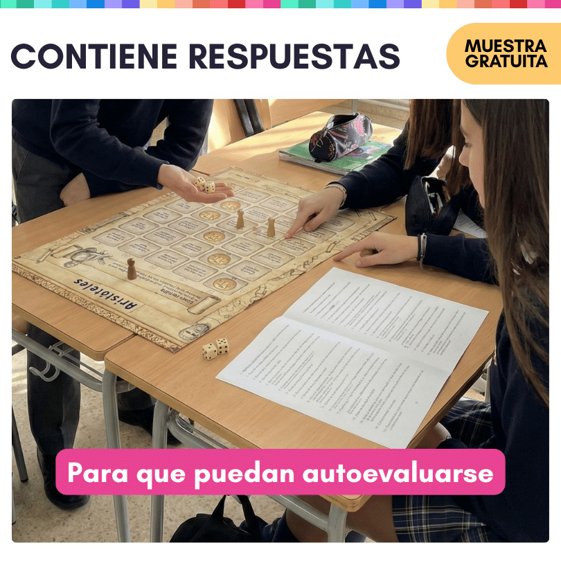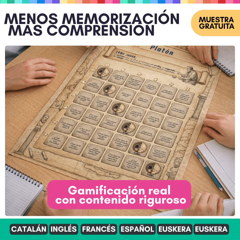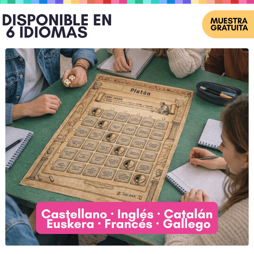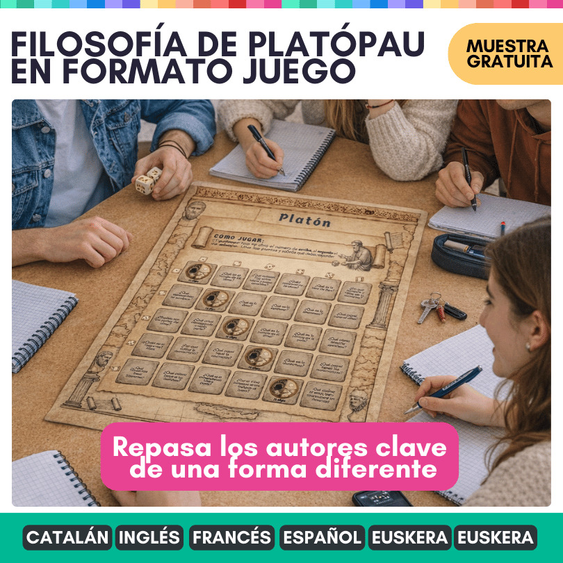 Este recurso es una muestra gratuita del tablero gamificado de Platón, diseñada para que puedas conocer de primera mano la dinámica y el enfoque pedagógico del material completo de Juegos de repaso de Filosofía para la PAU/EBAU.