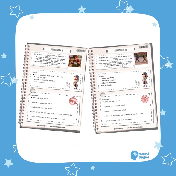Este nivel 2 del recurso Inferencias con misterios está diseñado para profundizar en el razonamiento inferencial a través de situaciones más largas y complejas, en las que aparecen interacciones sociales, conflictos cotidianos y emociones menos evidentes.