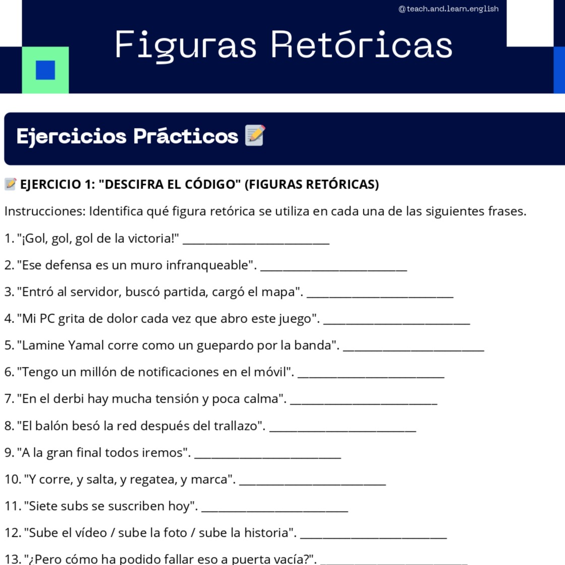 Ejercicio 1 ("Descifra el código"): 20 frases cortas para identificar una figura retórica específica, incluyendo referencias a directos aburridos, notificaciones de móvil y jugadas de Vinícius.