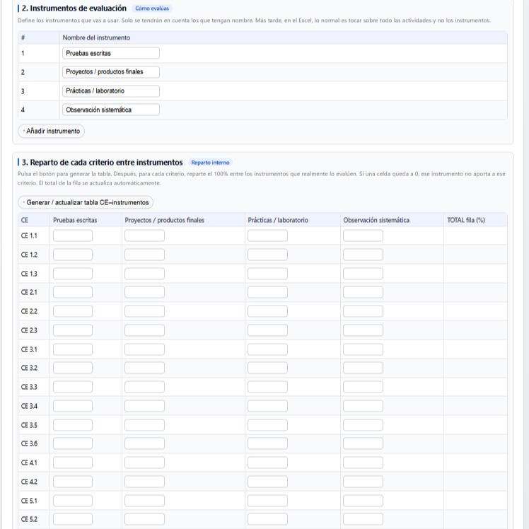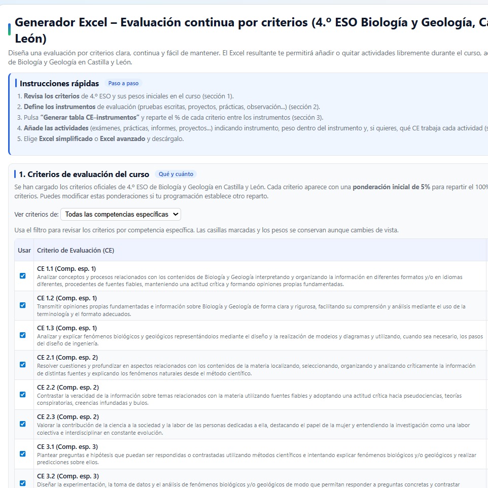 El sistema permite diseñar toda la estructura de evaluación del curso en pocos minutos, generando automáticamente un Excel profesional que calcula las ponderaciones y organiza el seguimiento del alumnado.
