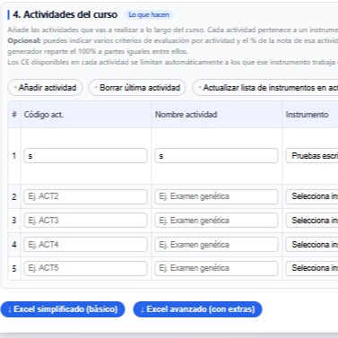 A partir de la selección de criterios y actividades, el sistema genera un Excel estructurado para el seguimiento de la evaluación durante todo el curso.