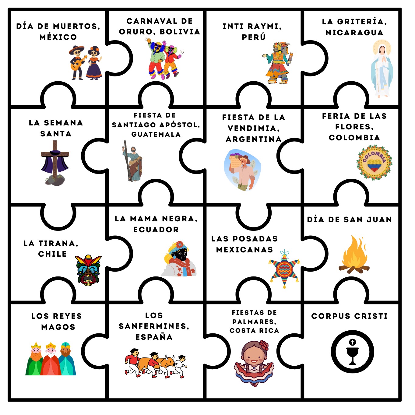 Este recurso incluye un puzzle recortable sobre celebraciones hispanas, donde los estudiantes aprenden y relacionan imágenes y vocabulario de fiestas como Día de Muertos, Carnaval, Las Posadas, Feria de Abril, San Fermín, Cinco de Mayo, La Tomatina, Reyes Magos, y más.