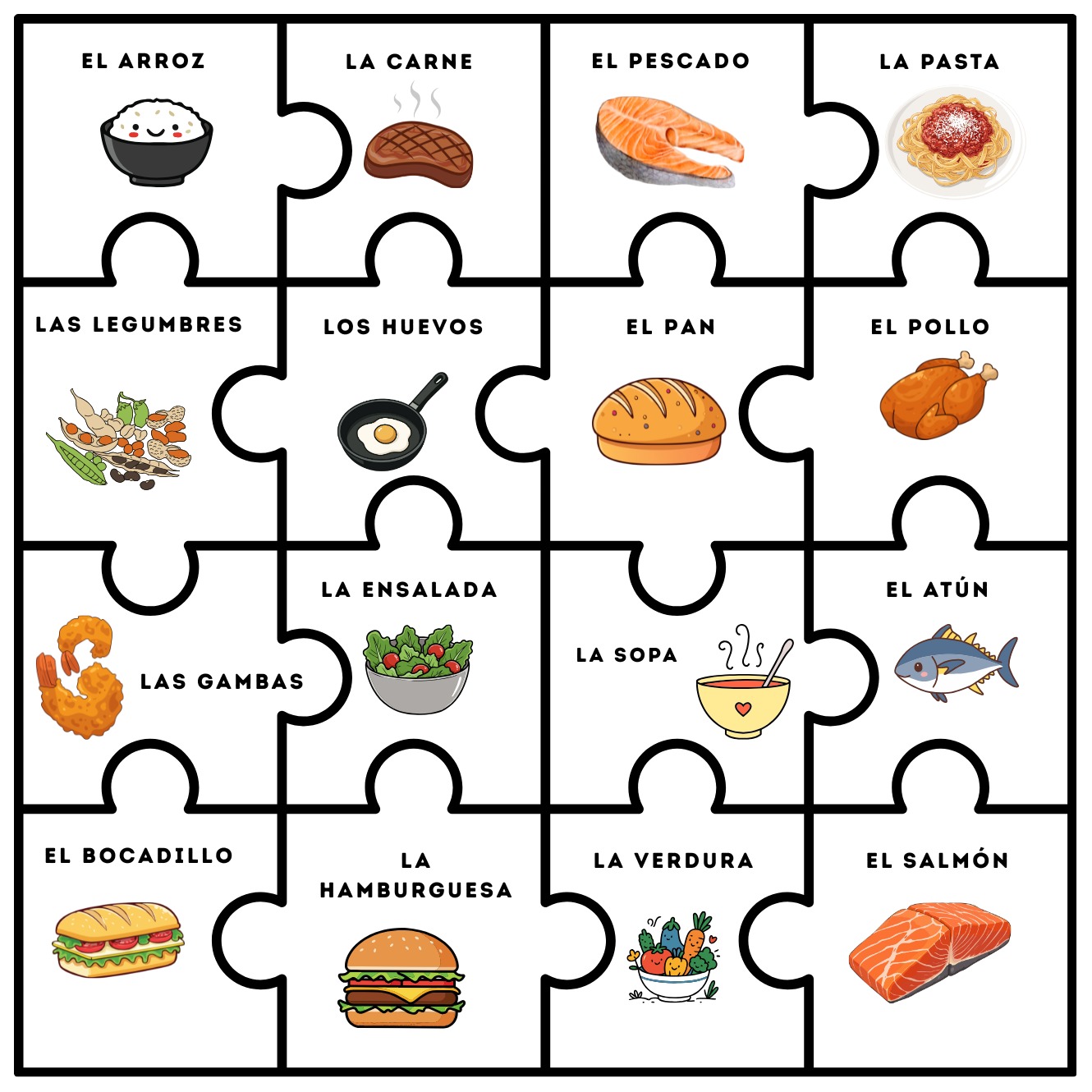 Learn Spanish food vocabulary with this fun cut-and-paste puzzle activity. Students cut, match, and glue the correct pieces to connect food pictures with their Spanish words.