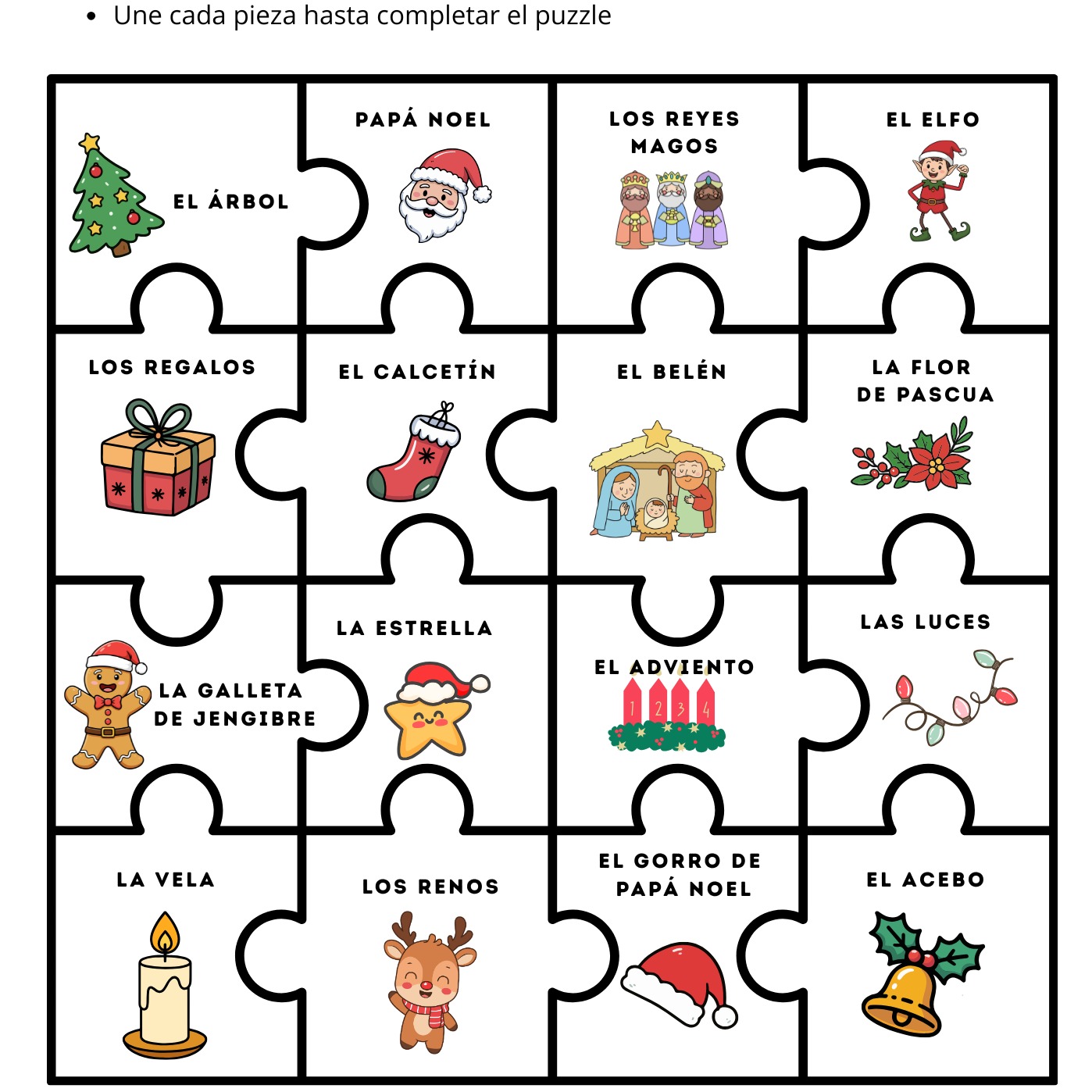 Este recurso es un puzzle recortable de vocabulario navideño en español, ideal para aprender y reforzar palabras típicas de la Navidad de forma visual, divertida y manipulativa. Los estudiantes recortan, unen y completan el puzzle para practicar el vocabulario mientras desarrollan la memoria, la lógica y la comprensión léxica.