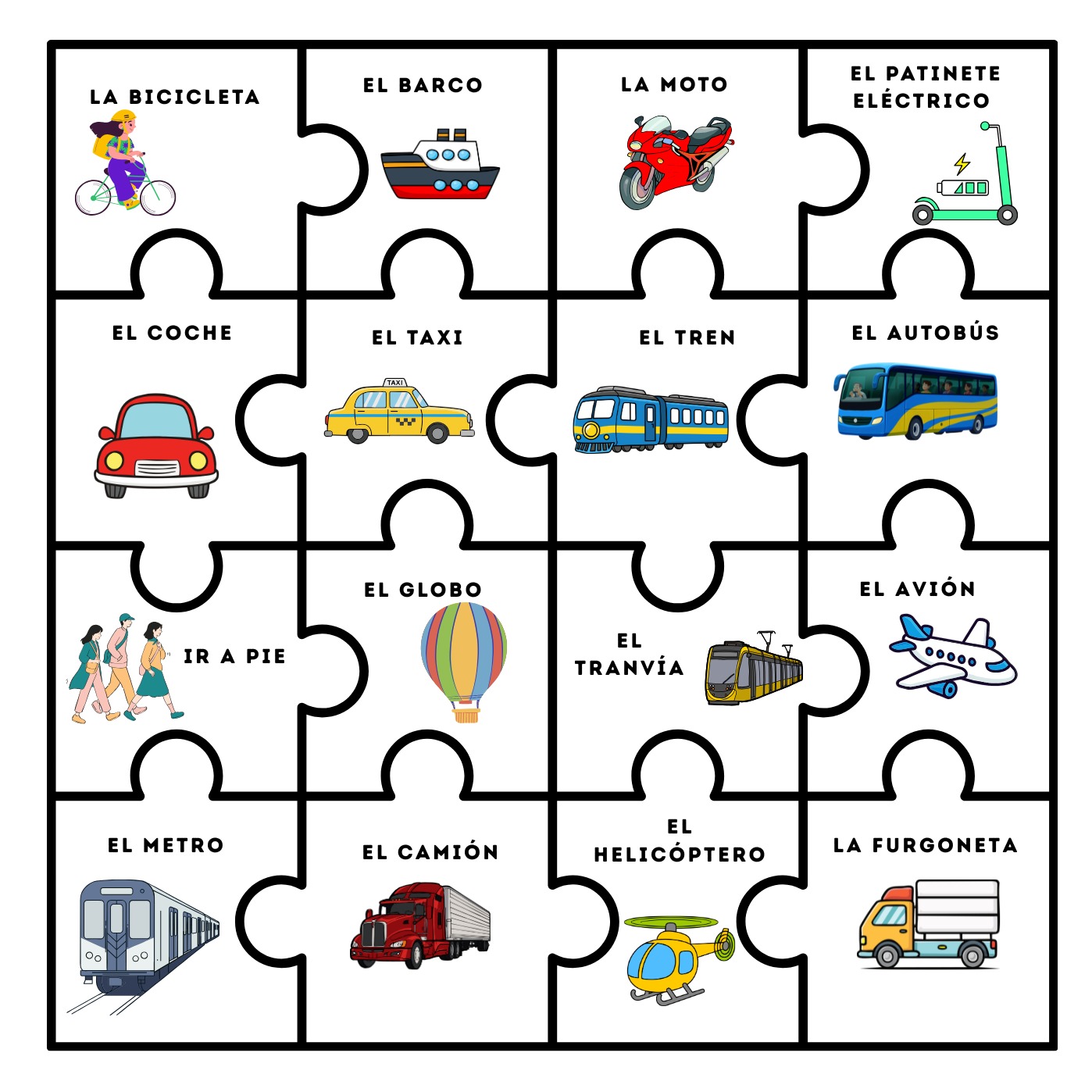 Aprende vocabulario de transportes en español con este divertido puzzle recortable. Los estudiantes deben recortar, unir y pegar cada medio de transporte con su palabra correspondiente, reforzando vocabulario de manera visual y divertida.