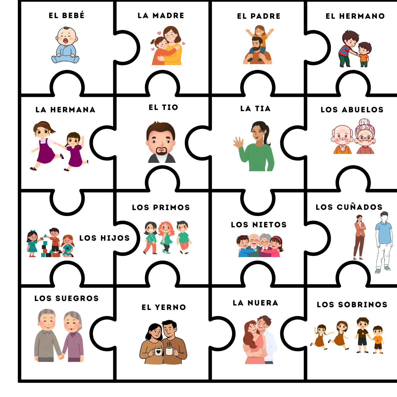Reinforce Spanish family vocabulary with this fun cut-and-paste matching puzzle. Students cut, match, and glue each family member to the correct Spanish word, making vocabulary practice easy and hands-on.