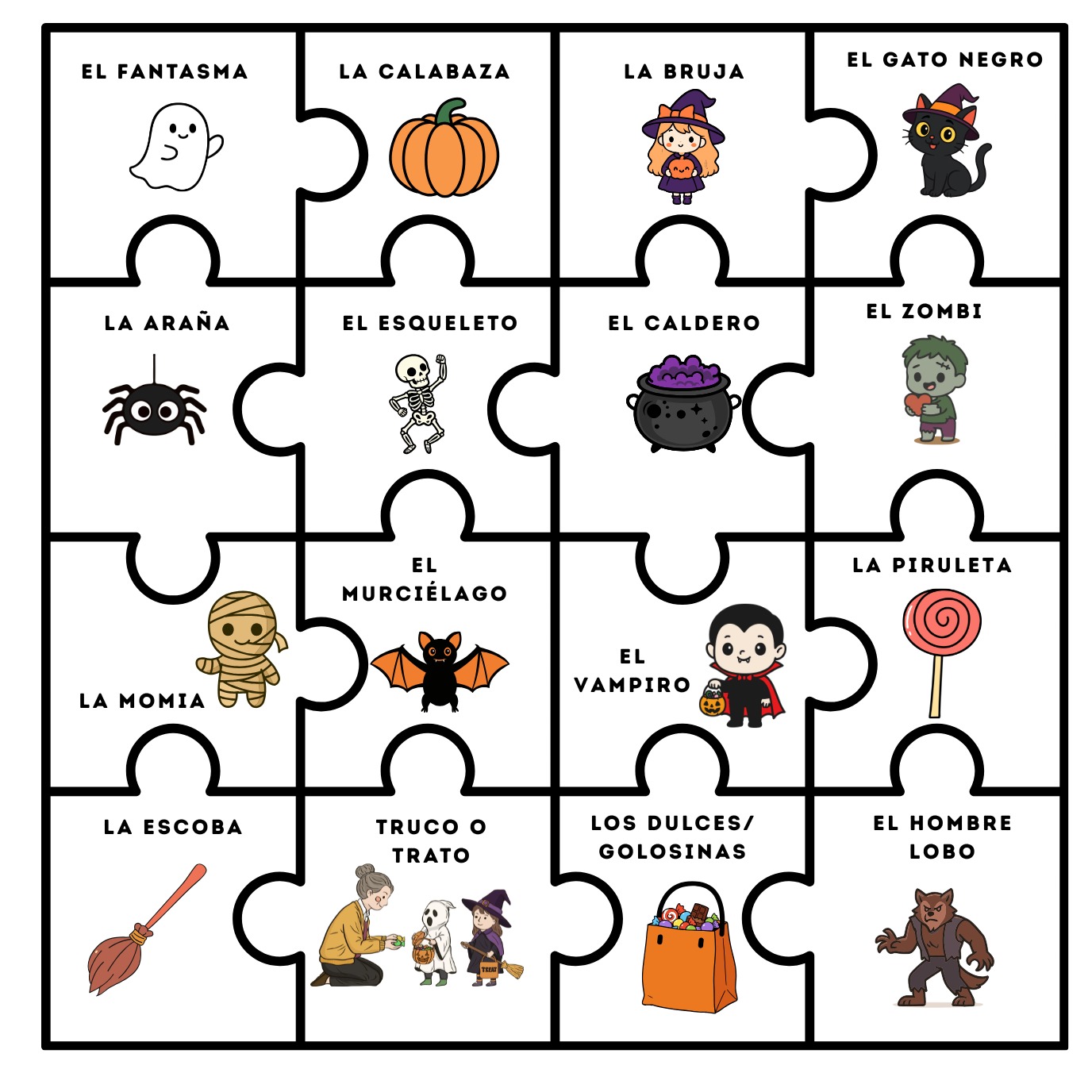 Este puzzle recortable de Halloween es una actividad divertida y visual para practicar el vocabulario típico de esta celebración: calabaza, fantasma, murciélago, casa encantada y más. Los estudiantes deben recortar y unir cada palabra con su imagen, reforzando el aprendizaje de manera manipulativa y entretenida.