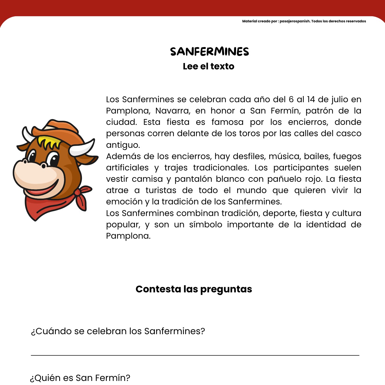 This resource includes a short and easy Spanish reading (A2 level) about Los Sanfermines, the famous festival in Pamplona, Spain. The text explains when it’s celebrated, what the “encierro” (running of the bulls) is, and how thousands of people enjoy music, food, and the traditional white and red outfits during this exciting event in July.