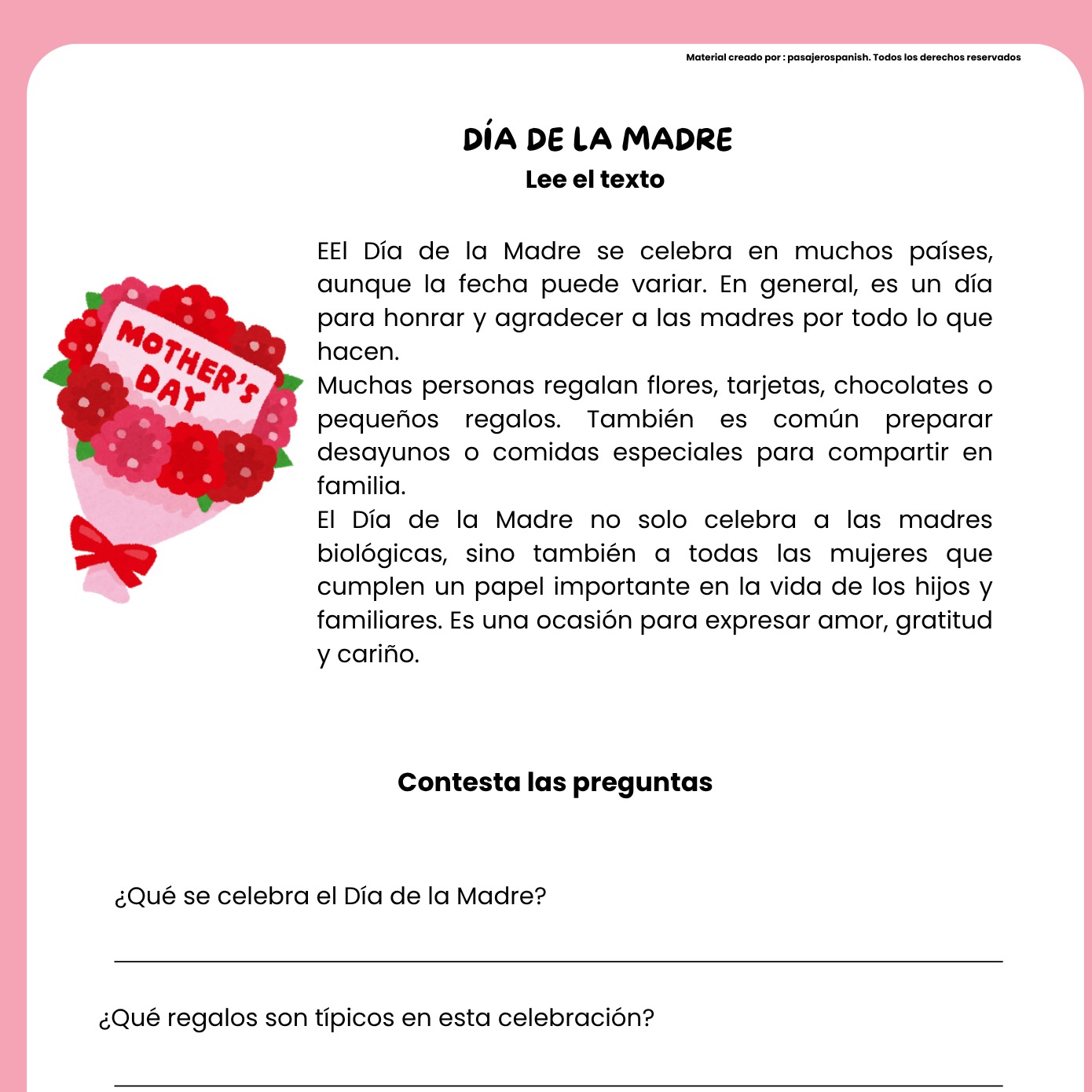 MOTHERS DAY READING IN SPANISH DÍA DE LA MADRE LECTURA