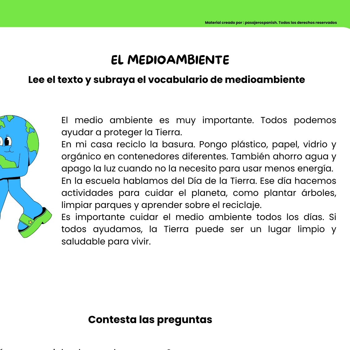 Este recurso incluye una lectura corta y sencilla (nivel A2) sobre el medioambiente y cómo cuidarlo. El texto habla sobre temas como el reciclaje, la contaminación, el agua, la energía y pequeñas acciones que todos podemos hacer para proteger el planeta.