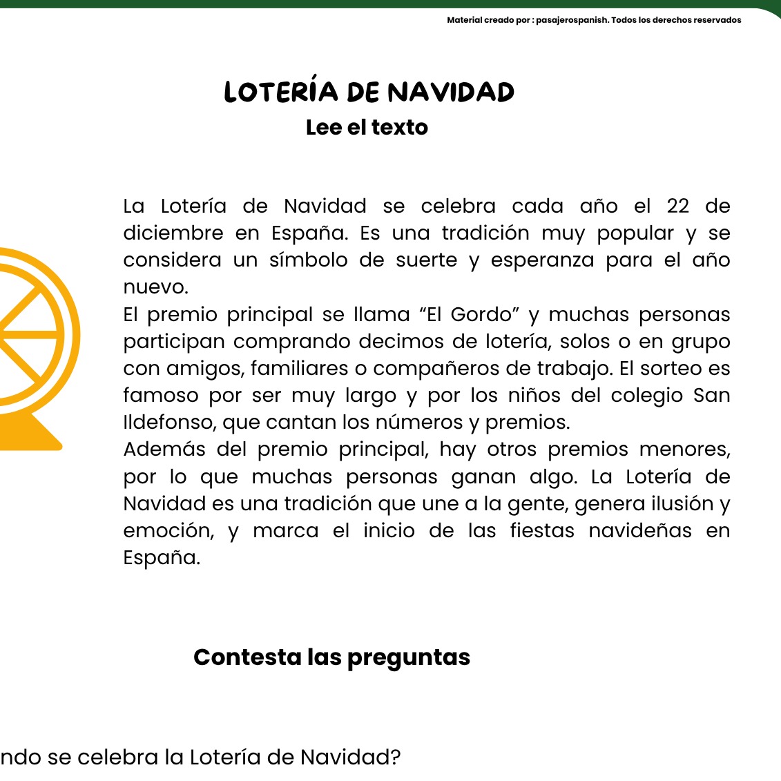 Este recurso presenta una lectura corta y sencilla (nivel A2) sobre la Lotería de Navidad, una de las tradiciones más importantes de España durante las fiestas. El texto explica cuándo se celebra, cómo funciona el sorteo, qué significa “El Gordo” y cómo las personas compran décimos para compartir la suerte con familia y amigos.