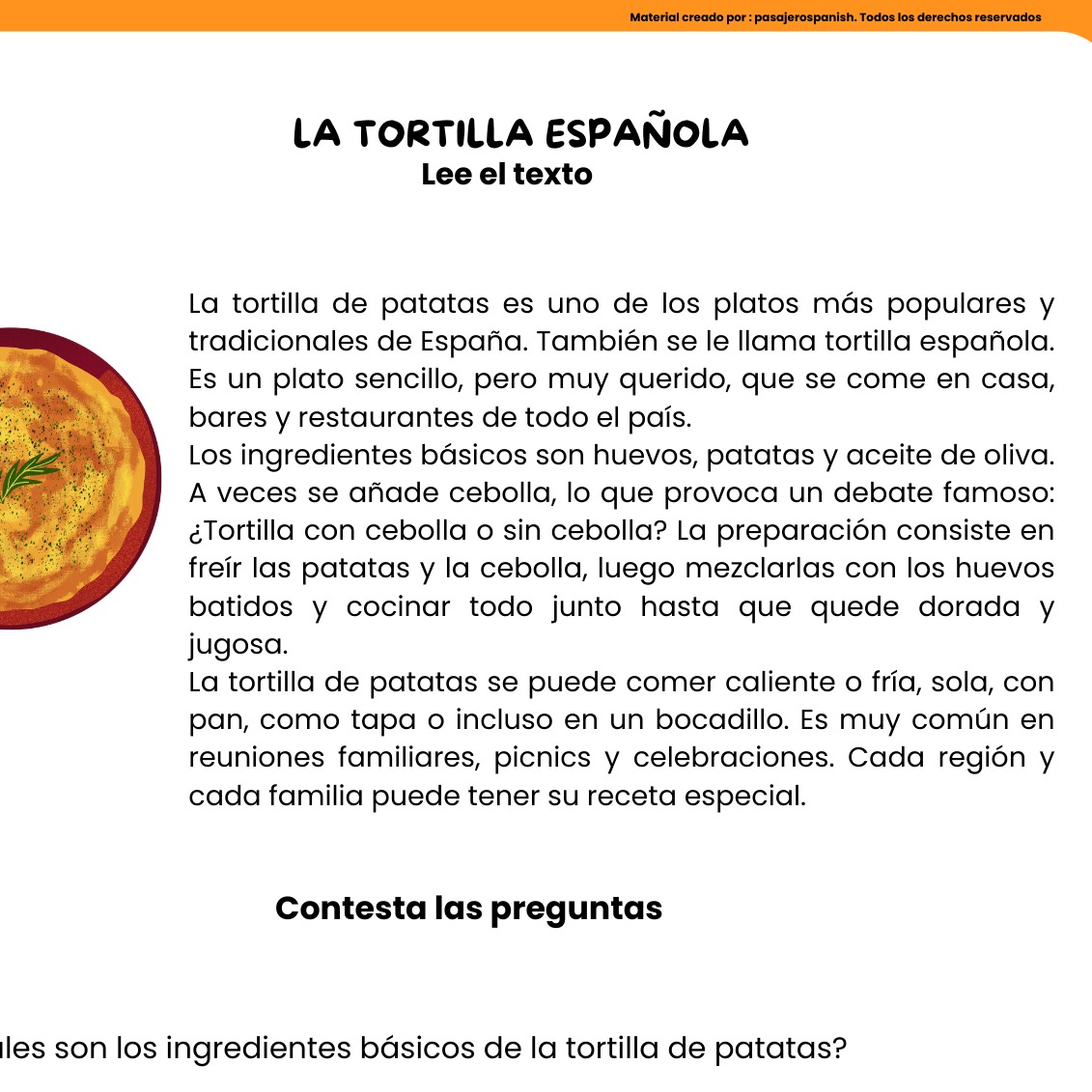 Este recurso incluye un reading corto y sencillo (nivel A1-A2) sobre uno de los platos más famosos de España: la tortilla de patatas. El texto está acompañado de preguntas de comprensión, vocabulario clave y actividades extra, perfecto para practicar la lectura en clases de español como lengua extranjera.