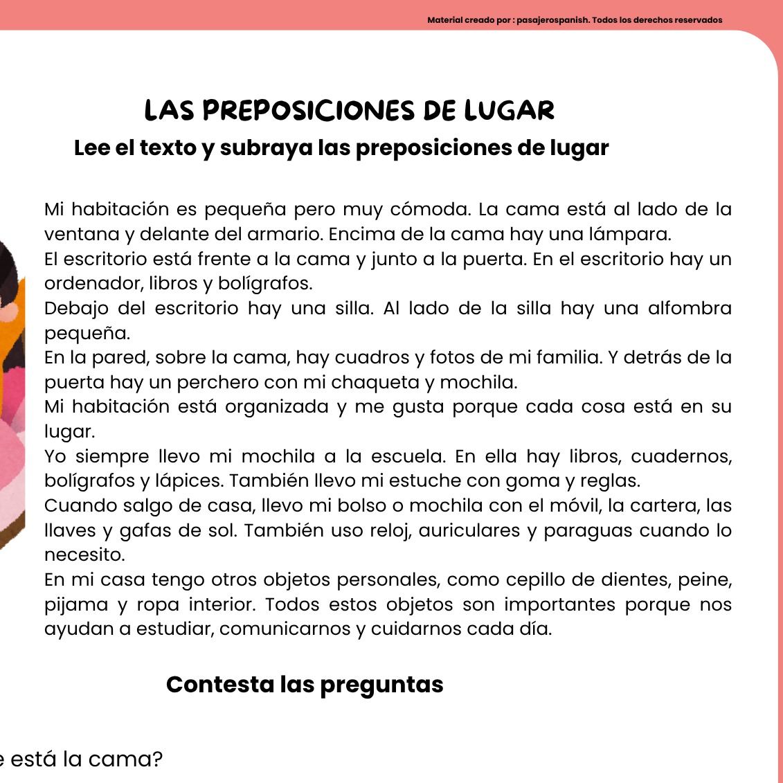 Este recurso incluye una lectura corta y sencilla (nivel A1) para aprender y practicar las preposiciones de lugar en contexto. El texto describe una habitación y explica dónde están los objetos, usando expresiones como encima de, debajo de, al lado de, entre, delante de, detrás de, cerca de, lejos de, etc.