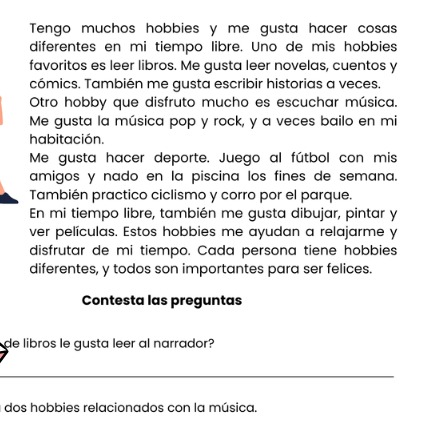 Este recurso incluye una lectura corta y sencilla (nivel A1-A2) sobre el tiempo libre y los pasatiempos. El texto presenta a diferentes personas que explican qué hacen en su tiempo libre, con actividades como leer, escuchar música, ver películas, hacer deporte, cocinar, viajar, y más.