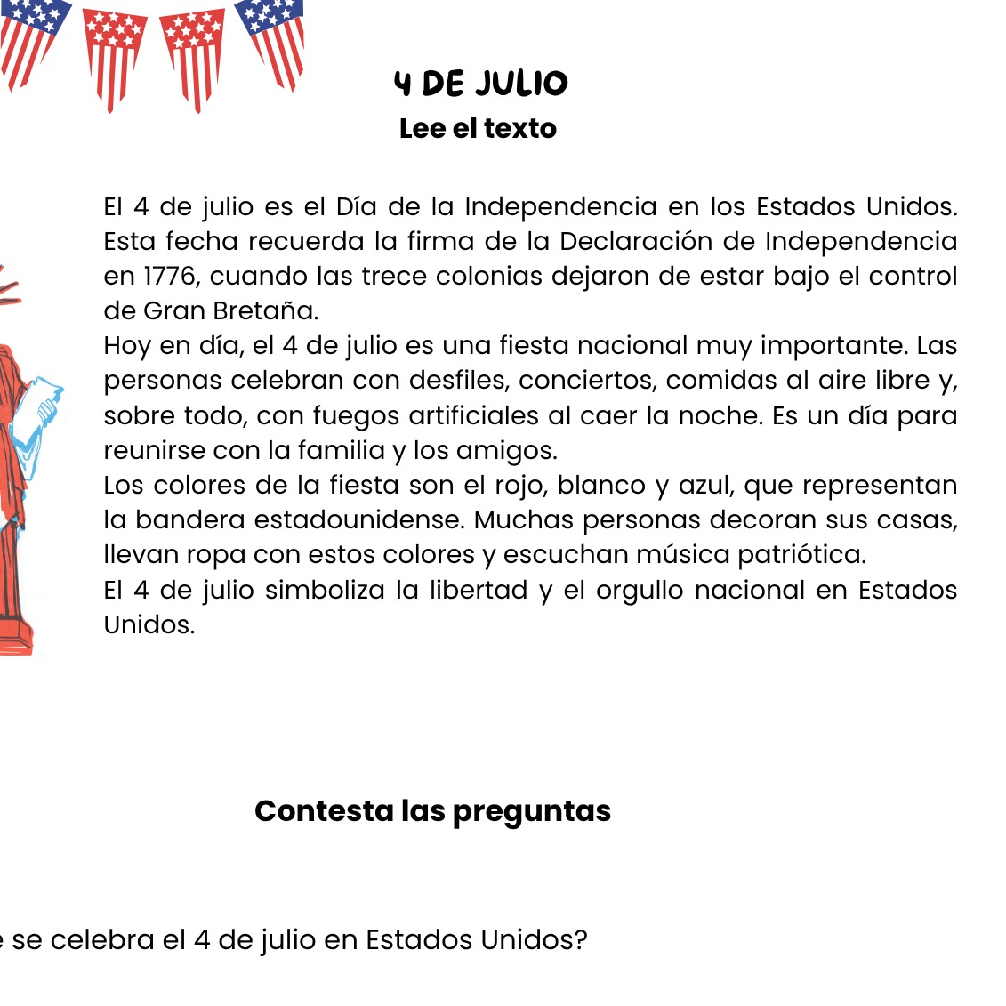 Lectura en español: El 4 de julio (Día de la Independencia de Estados Unidos)