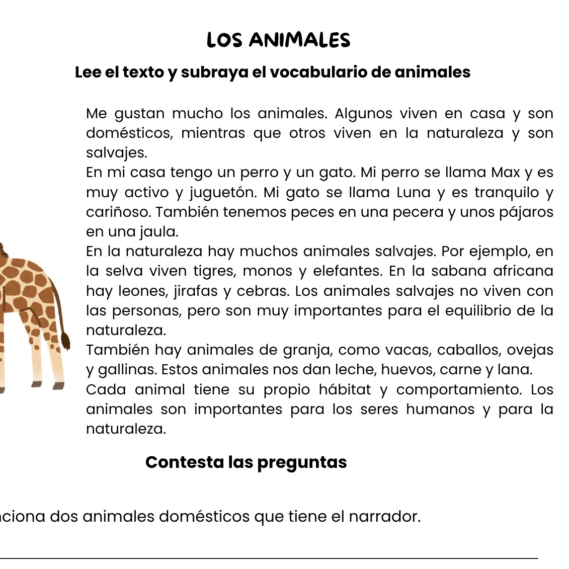 LOS ANIMALES READING ANIMALS IN SPANISH LECTURA