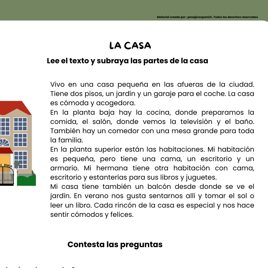 Este recurso incluye una lectura corta y sencilla en español (nivel A1-A2) sobre la casa en español
