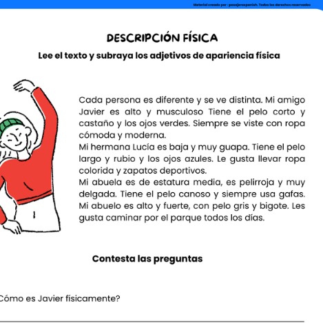 Este recurso incluye una lectura corta y sencilla (nivel A1-A2) sobre la descripción física de las personas. El texto presenta vocabulario básico para hablar del aspecto físico, como alto, bajo, delgado, fuerte, joven, mayor, rubio, moreno, pelirrojo, y también palabras relacionadas con los ojos, el pelo y la estatura.