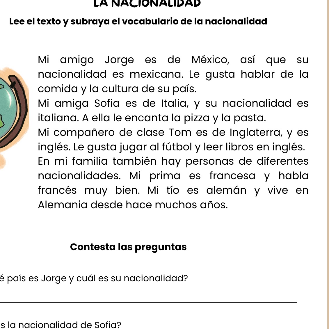 Este recurso incluye una lectura corta y sencilla (nivel A1-A2) sobre las nacionalidades y los países. El texto presenta a diferentes personas que hablan de dónde son, qué idiomas hablan y qué les gusta de su país.