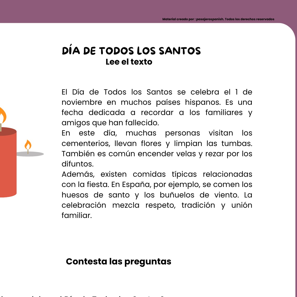 Este recurso incluye un reading corto y sencillo (nivel A1-A2) sobre el Día de Todos los Santos, una tradición importante en los países hispanos. El texto explica cómo las familias visitan los cementerios, llevan flores y recuerdan a sus seres queridos. También se mencionan comidas típicas de la fecha, como los huesos de santo o los panellets.