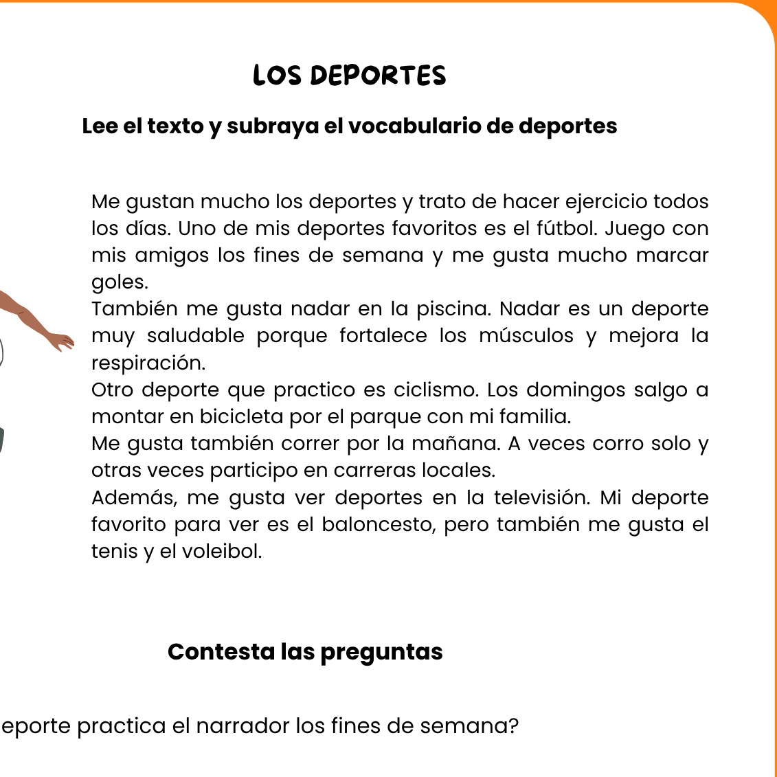 Incluye preguntas de comprensión, vocabulario clave y actividades extra, ideales para reforzar EL VOCABULARIO DE DEPORTES
