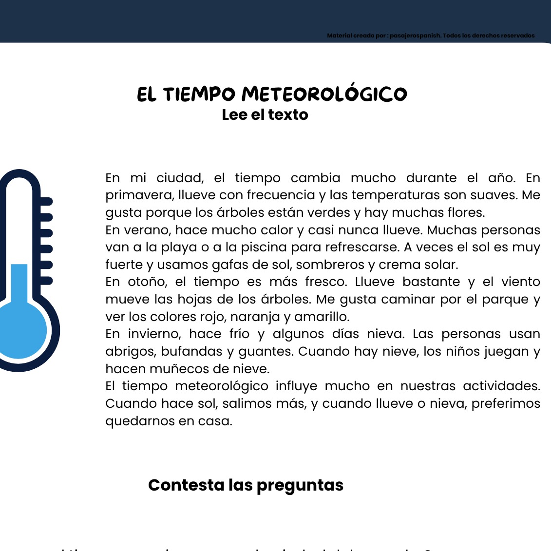 This resource includes a short and simple reading (A1-A2 level) about weather and the seasons of the year. The text introduces basic vocabulary such as hace frío, hace calor, llueve, nieva, está nublado, etc. It also comes with comprehension questions, key vocabulary, and extra activities, making it perfect for beginner Spanish learners.