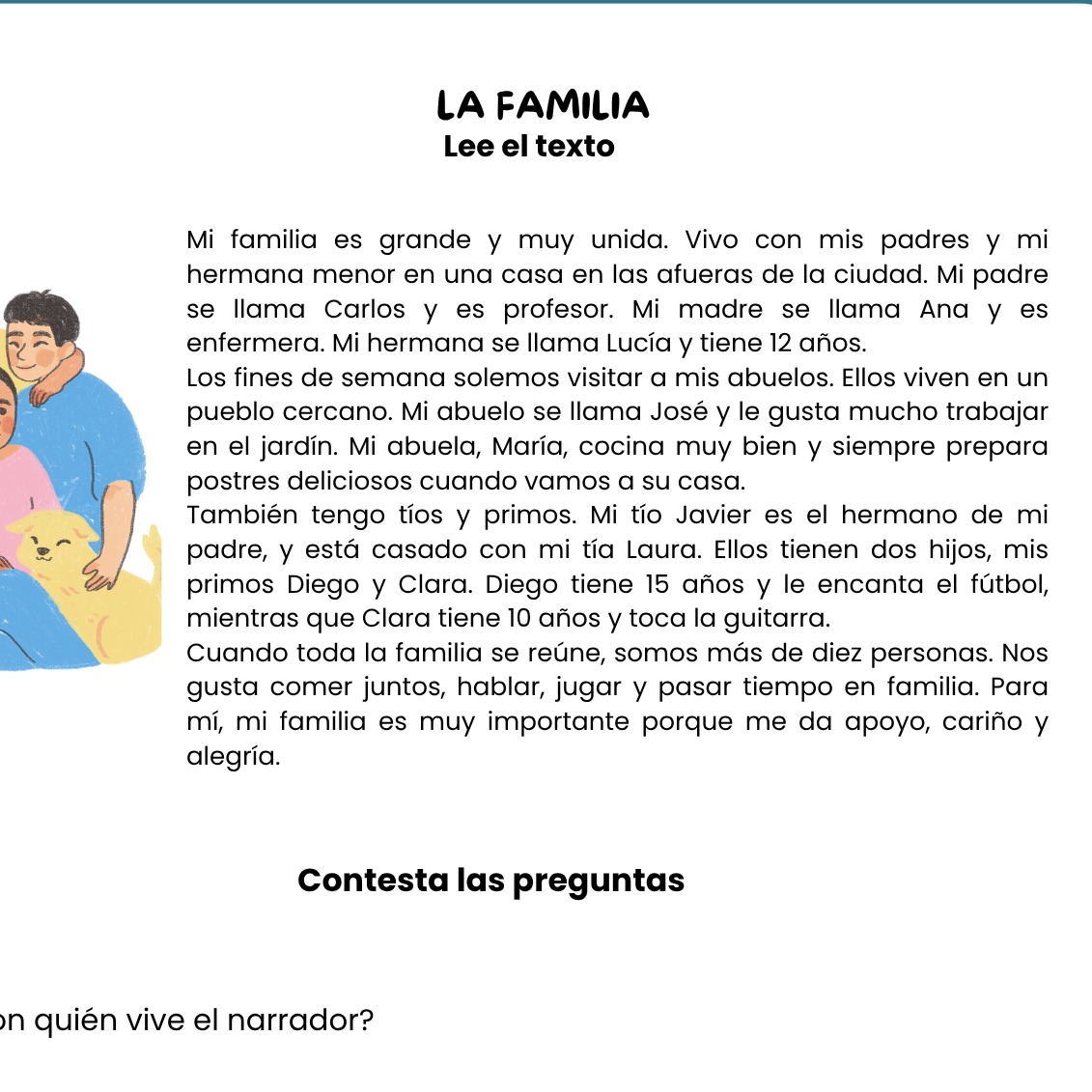 Este recurso incluye un reading corto y sencillo (nivel A1-A2) sobre la familia. El texto presenta vocabulario básico como padres, hijos, abuelos, tíos, primos, hermanos, etc. Además, está acompañado de preguntas de comprensión, vocabulario clave y actividades extra, ideal para estudiantes de español como lengua extranjera.