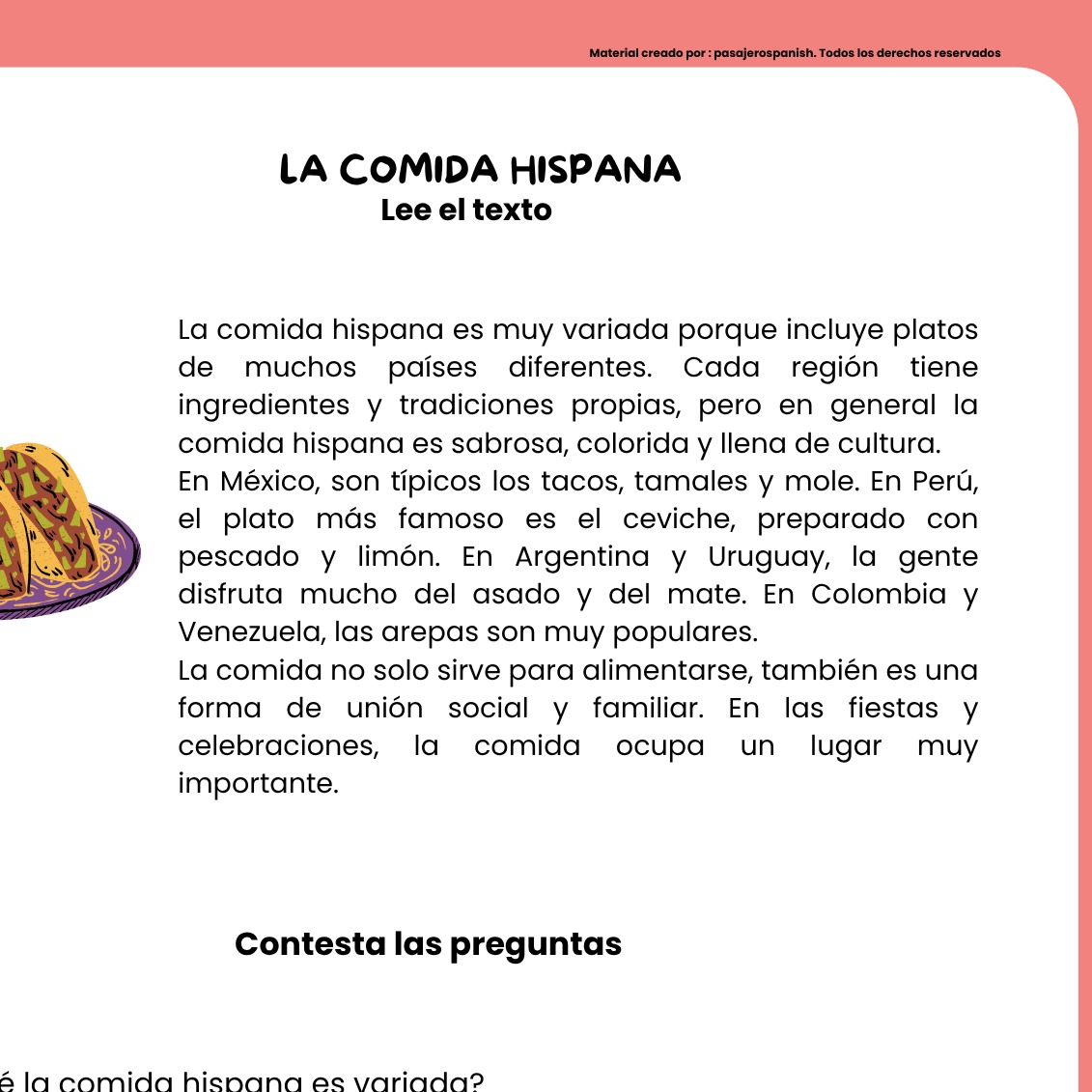 This resource includes a short and simple reading (A1-A2 level) about Hispanic food. The text introduces traditional dishes from different Spanish-speaking countries, such as tacos from Mexico, paella from Spain, empanadas from Argentina, and ceviche from Peru.