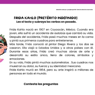 - Lectura en español sobre Frida Kahlo en pretérito indefinido
