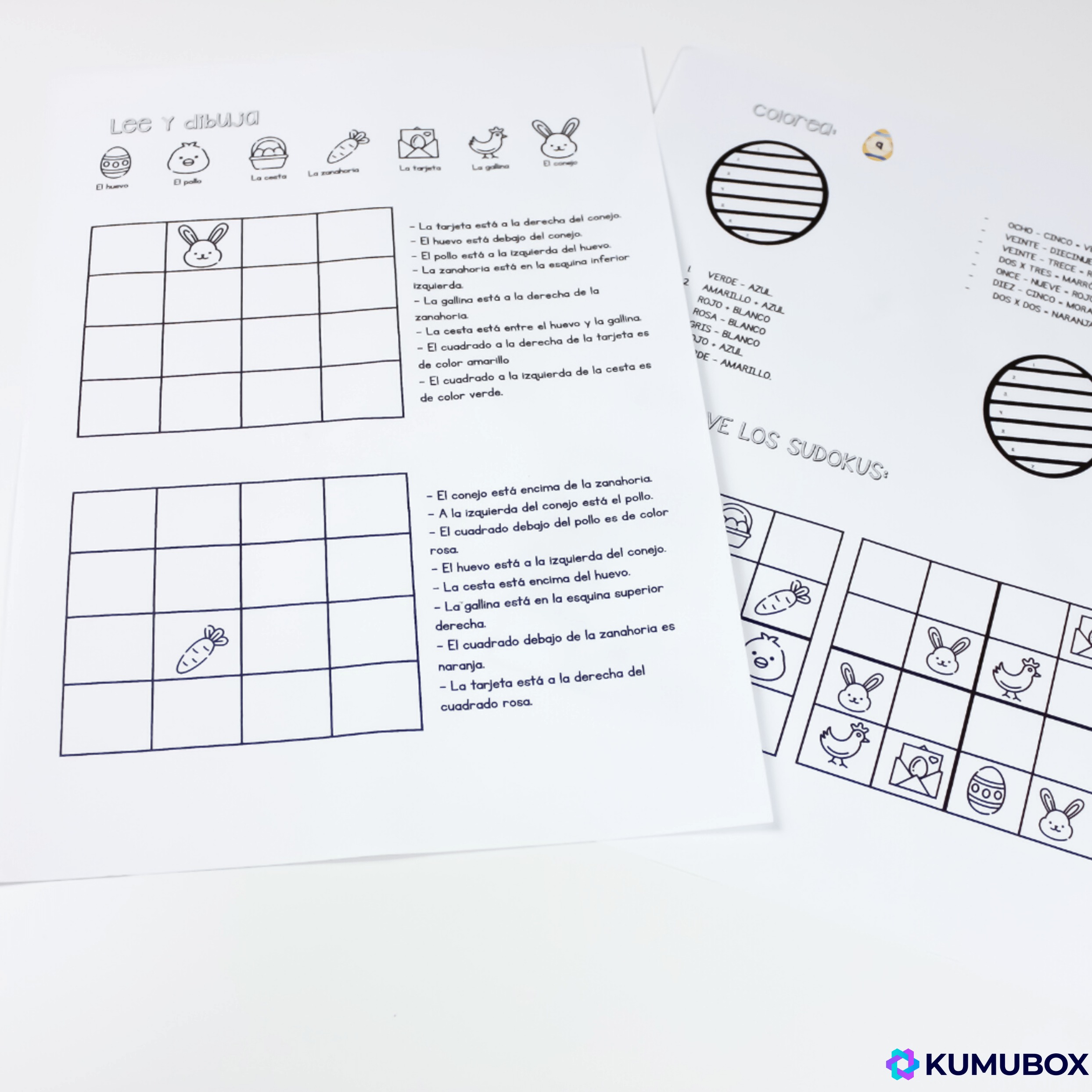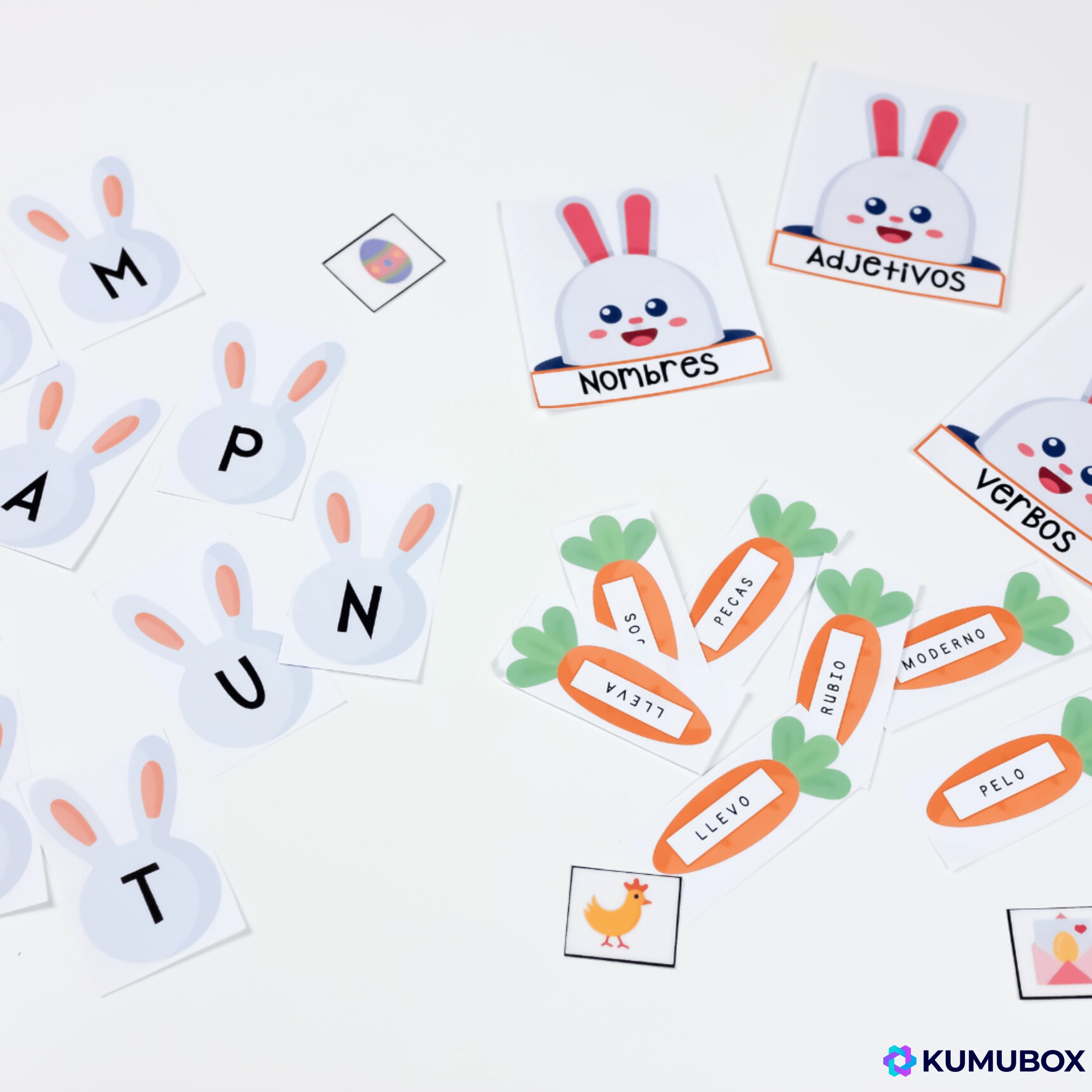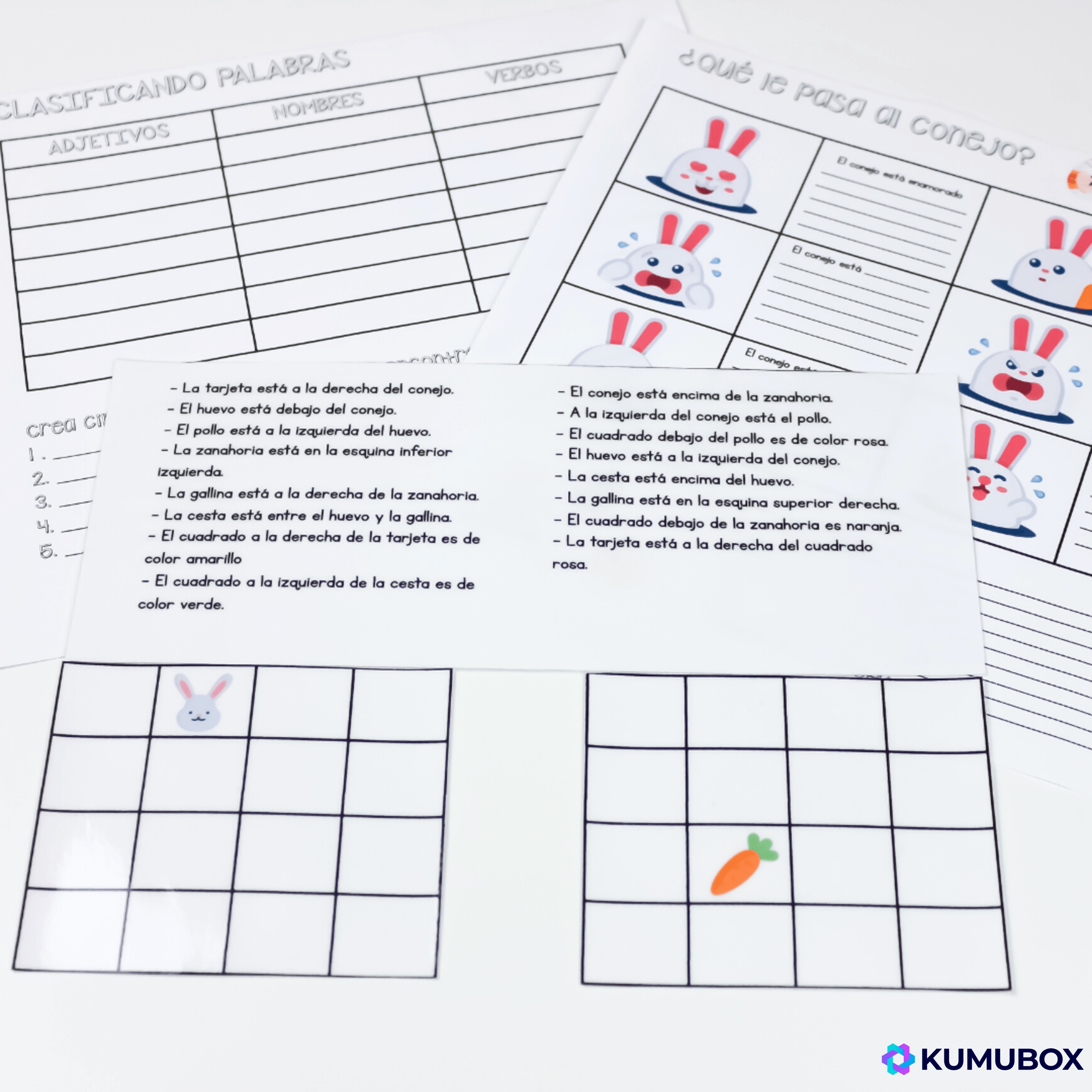 El “PACK PASCUA – Plantillas” contiene una selección de actividades imprimibles y dinámicas para trabajar contenidos lingüísticos de forma lúdica y significativa. El alumnado clasifica sustantivos, adjetivos y verbos, corrige errores gramaticales, crea historias a partir de iconos y empareja vocabulario bilingüe. También se incluyen tareas visuales como “lee y dibuja”, puzzles matemáticos para colorear, y descripciones para diseñar un conejo. El pack desarrolla competencias en lectura, escritura, emociones, lógica y creatividad. Ideal para el segundo y tercer ciclo de Primaria o en contextos bilingües (español–inglés).