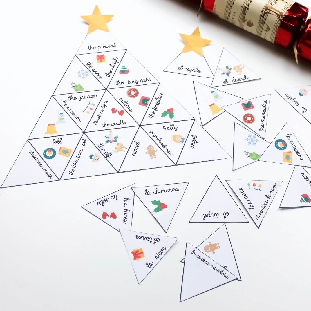 El recurso “Tarsia – Navidad” es una actividad manipulativa basada en el formato de rompecabezas Tarsia. Incluye tarjetas con vocabulario típico de la Navidad en inglés y español (como el regalo – the present, las luces – the lights, el roscón – the king cake). El alumnado debe emparejar los fragmentos correctos formando figuras triangulares o en estrella. Es una herramienta ideal para reforzar vocabulario de forma lúdica, fomentar el trabajo en equipo, y repasar términos relacionados con las festividades. Puede utilizarse como actividad de aula, rincón temático o juego para celebraciones escolares.